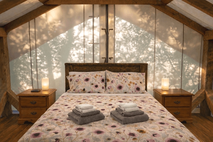 Each tent is set in its own private space, with generous distance and trees between sites. You won’t see or hear other guests from your tent, so it feels quiet and secluded.